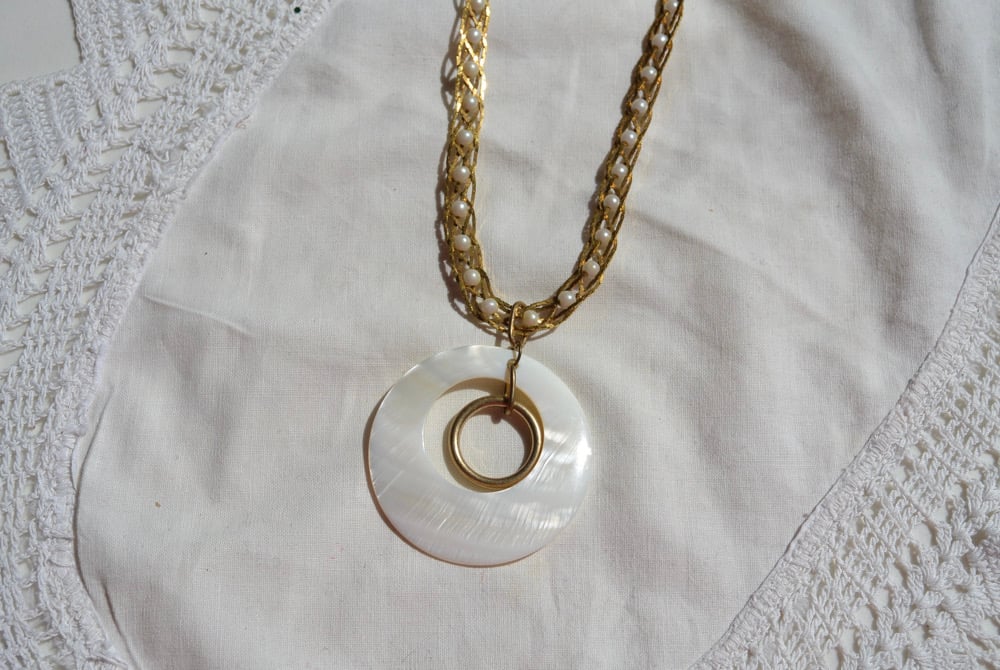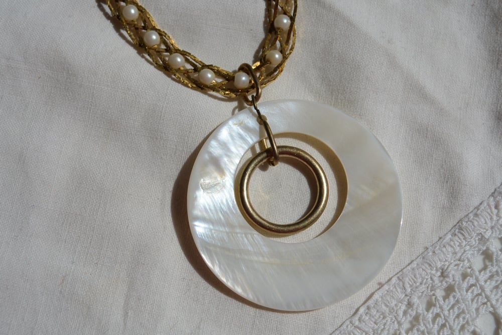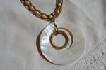 mother of pearl pendant with gold tone accents on woven gold tone chain