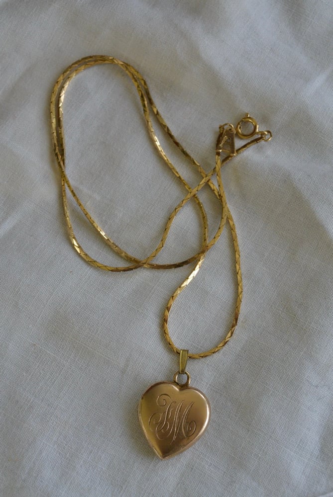 antique 1910/20s gold filled locket with initials “F” and “M” on gold filled chain