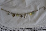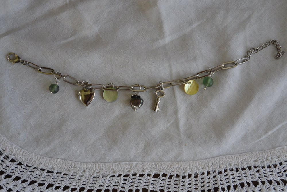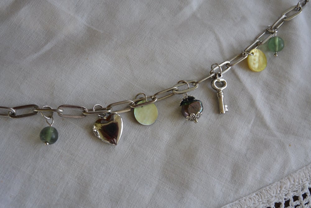 silver tone charm bracelet with mother of pearl charms, faux pearl, and silver tone locket