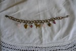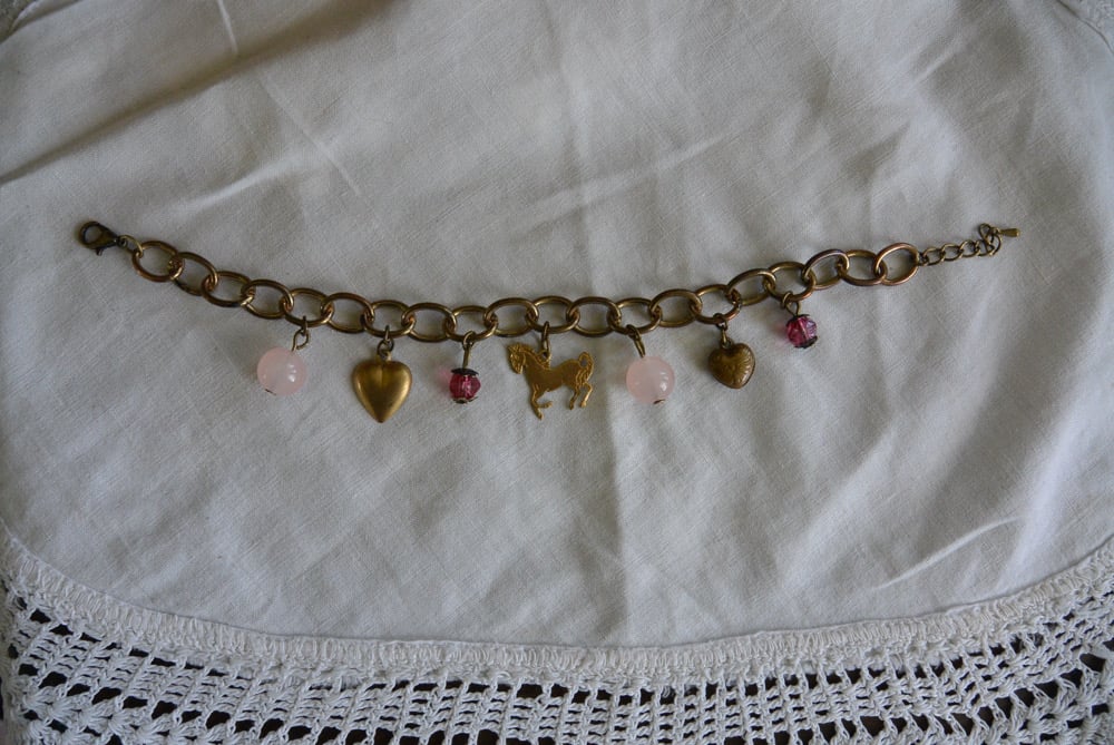 gold tone charm bracelet with antique brass charms including puffy heart and unicorn